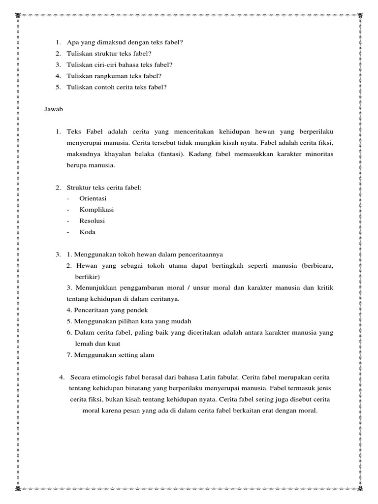 Cerita fabel merupakan cerita tentang kehidupan binatang yang berperilaku menyerupai manusia. Orang/ hewan yang menjadi pelaku dalam cerita (tokoh protagonis, atau antagonis, tokoh utama atau tokoh pembantu). Tokoh utama dalam cerita fabel adalah binatang. Adapun materi teks cerita fabel yang akan kita bahas kali ini yaitu tentang pengertian, struktur teks, kaidah kebahasaan, dan juga contoh teks cerita fabel singkat beserta strukturnya. 10.jelaskan pembagian latar cerita dalam cerita fabel! Fabel termasuk jenis cerita fiksi, bukan kisah tentang kehidupan nyata. Tokoh utama di dalam cerita fabel adalah hewan atau binatang. Didalam fabel juga memiliki ciri ciri seperti dibawah ini: Orientasi, yaitu bagian awal berisi pengenalan tokoh, latar tempat dan waktu, dan awalan masuk ke tahap berikutnya. Tema dari cerita fabel tersebut umumnya mengenai hubungan sosial. Demikianlah penjelasan terlengkap mengenai √ fabel : Peningkatan keterampilan menulis fabel menggunakan media gambar seri siswa kelas vii.a smp negeri 2 kediri. Fabel merupakan cerita fiksi atau khayalan belaka.